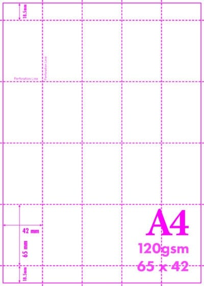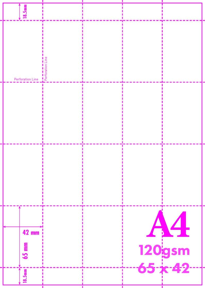 A4 MICRO PERFORATED CARD. Creates twenty 65mm x 42mm size cards when separated.